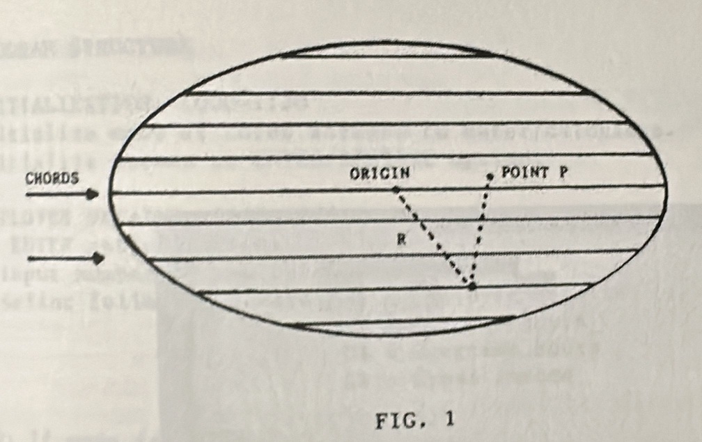 Se prendiamo un’ellisse (fig. l) e tracciamo, ad esempio, 5 corde su di essa, possiamo scegliere dei punti lungo ciascuna corda. Questi punti hanno una distanza dall’origine (R) e tracciano un punto (P) dove (P) è sempre una funzione di (R).