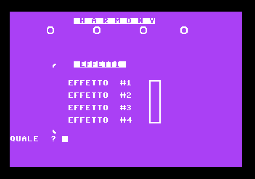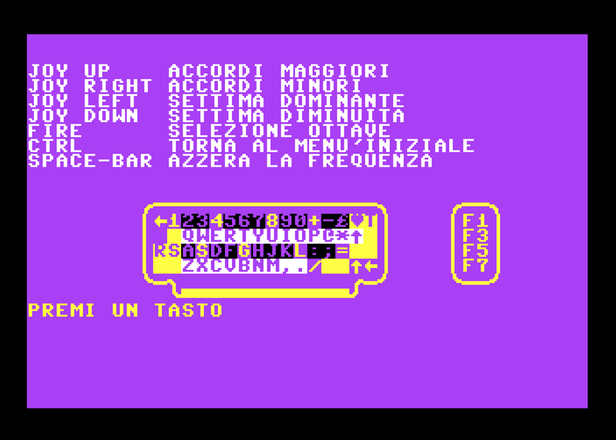 Il programma mostra poi la selezione fra i 4 effetti disponibili e dopo la scelta dell’utente, mostra una tastiera virtuale sullo schermo simulando i tasti bianchi e neri di un sintetizzatore su due file di ottave (note basse nella parte superiore, più alte in quella inferiore). A quel punto siamo pronti a suonare e a provare melodie e accordi vari. La leva del joystick in porta 2 e il pulsante di fuoco cambieranno il tipo di accordi e le ottave disponibili.