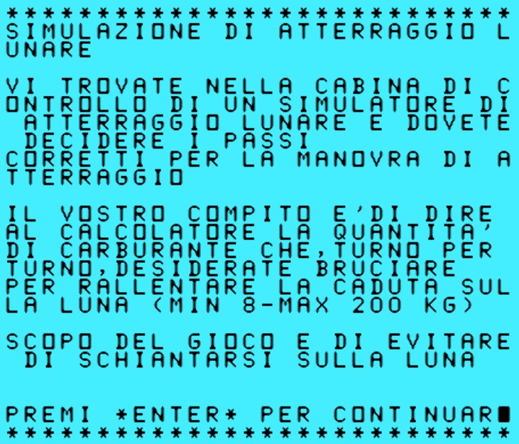 “Allunaggio” è un classico esempio di codice BASIC d’epoca, tipico dei primi simulatori lunari. Nonostante la sua semplicità e i limiti tecnici, può ancora regalare qualche minuto di divertimento a chi cerca la giusta strategia per bruciare il carburante al momento giusto.