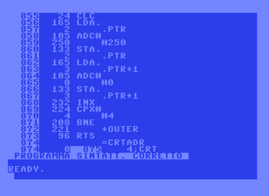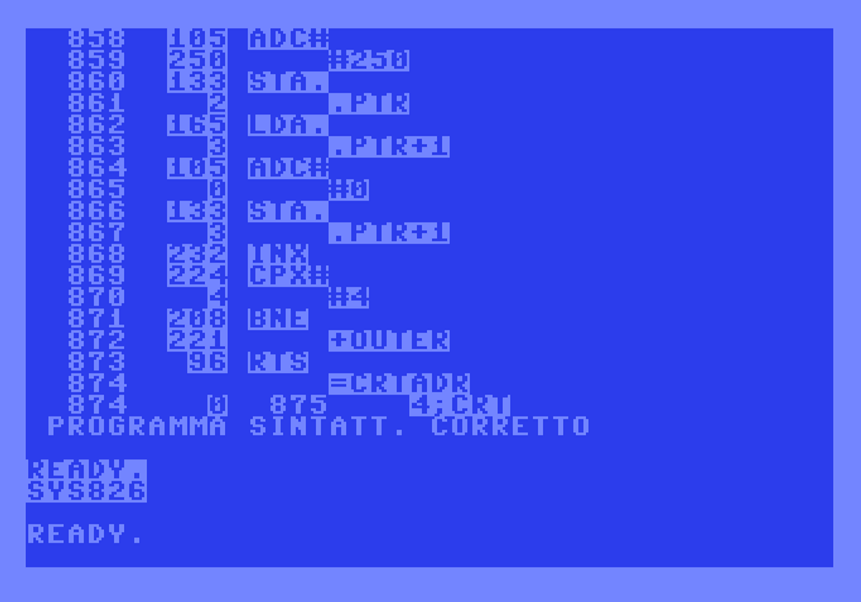 Per assemblare un nuovo programma occorrerà cancellare le righe da 1170 in avanti e sostituirle con quelle del nuovo listato scritto nel linguaggio assembly di questo particolare tool. Dopo aver scritto il nuovo programma in coda al listato principale basterà dare il RUN e attendere che il compilatore controlli il codice e segnali eventuali errori. Se tutto sarà andato bene, il programma sarà memorizzato in RAM e potrà essere lanciato con il comando SYS. Ovviamente si deve aver cura di memorizzare il codice del programma in L.M. in un’area di memoria diversa da quella del BASIC, dove opera il programma assemblatore.