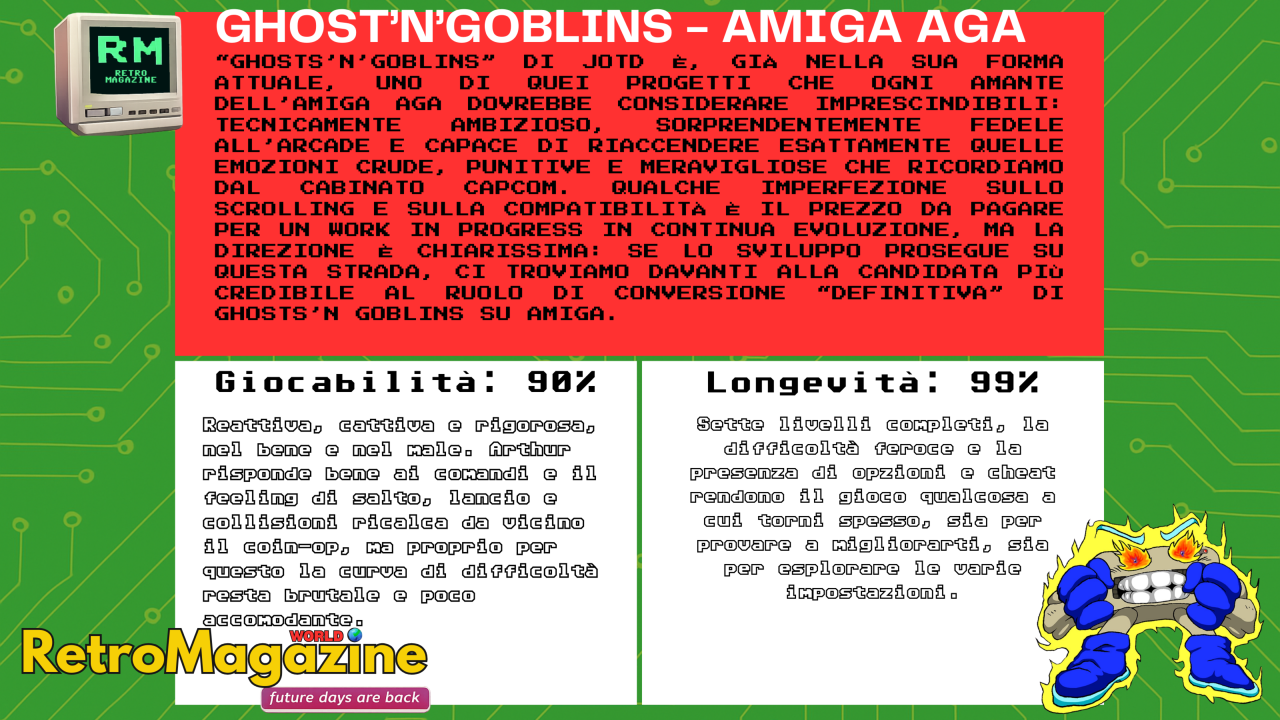 Nel complesso, questo “Ghosts’N’Goblins” è una delle reinterpretazioni Amiga più convincenti dell’arcade Capcom: rispettosa, tecnicamente ambiziosa e sostenuta da una community entusiasta che sta contribuendo a limarne gli spigoli. Se avete sempre sognato di soffrire come in sala giochi ma con l’AGA che pompa grafica e audio, questo port è già adesso un passaggio obbligato, destinato a diventare un punto di riferimento definitivo man mano che lo sviluppo prosegue.
