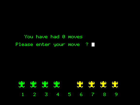 Dovete invertire completamente la posizione delle rane nel minor numero di mosse possibili. Le rane gialle devono andare al posto di quelle verdi e viceversa, lasciando la casella 5 vuota (come si vede dalle immagini). Io ci sono riuscito in 39 mosse, ma sono sicuro che si puo’ fare di meglio.