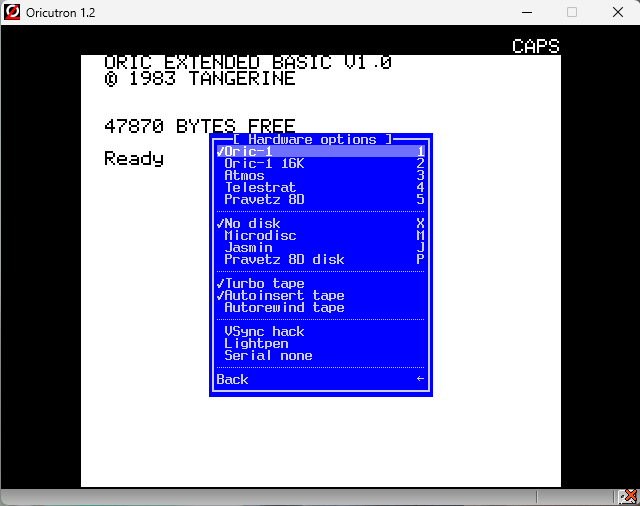 Una volta avviato l’emulatore cliccate il pulsante destro del mouse e scegliete l’opzione Hardware Options…, dopodiche’ selezionate Oric-1 come hardware (si vedano le immaginio sotto).