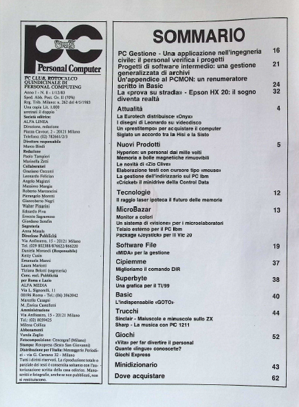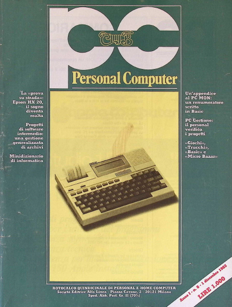 In evidenza in questo numero PC Gestione – Una applicazione nell’ingegneria civile: il personal verifica i progetti, un primo esempio di come il computer veniva usato in ambiente office in Italia. Un’appendice al PCMON: un renumeratore scritto in Basic, continuano gli articoli dedicato al software PCMON sviluppato dalla rivista. La «prova su strada» – Epson HX 20: il sogno diventa realtà, il sogno di vedere una calcolatrice trasformata in un personal computer!