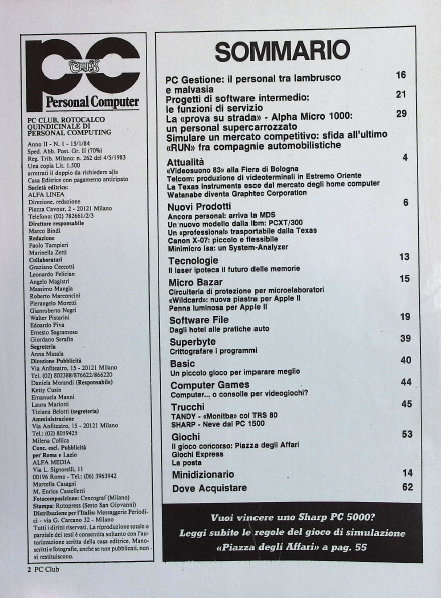 In evidenza in questo numero La «prova su strada» – Alpha Micro 1000: un personal supercarrozzato e Simulare un mercato competitivo: sfida all’ultimo «RUN» fra compagnie automobilistiche, un completo simulatore per affinare le competenze finanziarie e commerciali interamente scritto in Basic standard, adatto per tutti i computer.