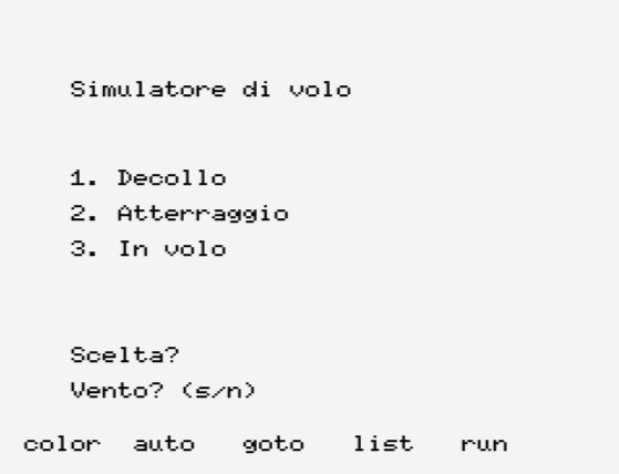 Descriviamo le tre opzioni che appaiono all’esecuzione del programma. Queste sono: decollareatterrare oppure iniziare già in volo. Con quest’ultima opzione ci evitiamo il compito di decollare, ma avremo il problema aggiuntivo di doverci dirigere verso l’aeroporto più vicino per atterrare e rifornirsi.