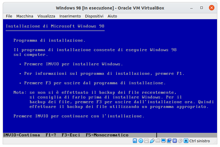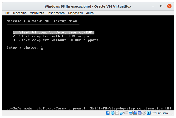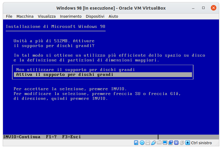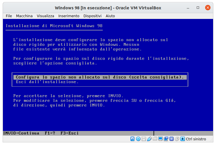 Fatto ciò, VirtualBox ci consiglierà la quantità di memoria RAM (64MB) e lo spazio su disco (2GB) da assegnare al sistema da emulare. Se abbiamo a disposizione un calcolatore performante, possiamo decidere di alzare la memoria RAM a 512MB, accettando i 2GB di disco rigido suggeriti che dovrà essere del tipo VDI (VirtualBox Disk Image) allocato dinamicamente. Fatto questo, clicchiamo su Avvia e, nella successiva finestra, selezioniamo il lettore host da cui installare Windows 98, che potrà essere o il disco originale, o un file .ISO . Una volta avviato il disco (fisico o virtuale), ci troveremo davanti alla schermata di installazione del sistema operativo (foto 1).